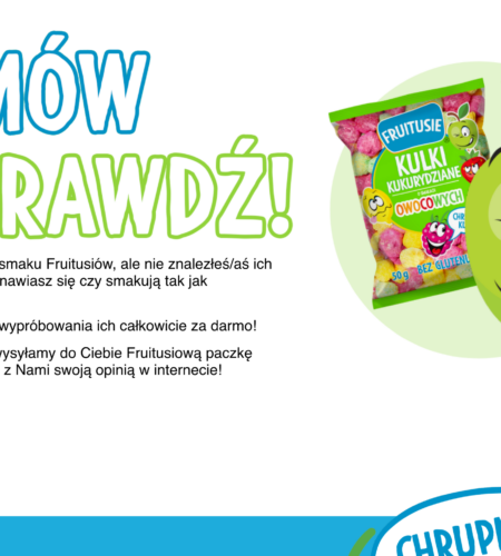 Fruitusie to bezglutenowe kulki kukurydziane produkowane przez firmę Chrupex z Bełchatowa od 1993 roku. Firma Snacklab udostępnia formularz na swojej stronie, przez który można zamówić paczkę próbek za darmo, bez kosztów wysyłki.